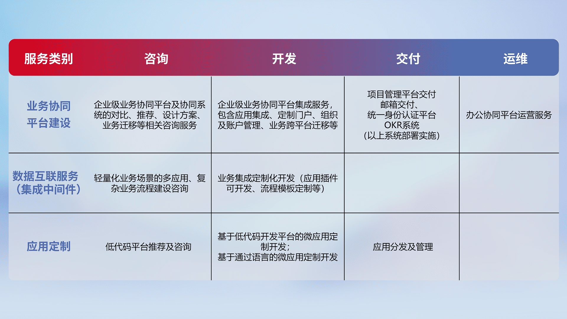 针对钉钉、、、企微、、IDaas等平台级产品提供产品的规划、、方案、、、交付、、、、定制化开发等服务,,实现如统一协同办公、、、智能客户服务、、混合会议管理、、、智能数据查询、、、、等业务场景,,,实现数字化转型。。